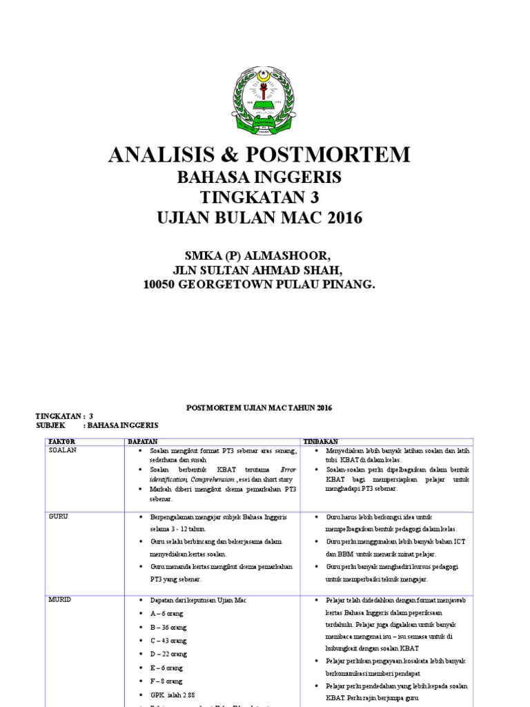 Analisis Postmortem Bahasa Inggeris Tingkatan 3 Ujian Bulan Mac 2016