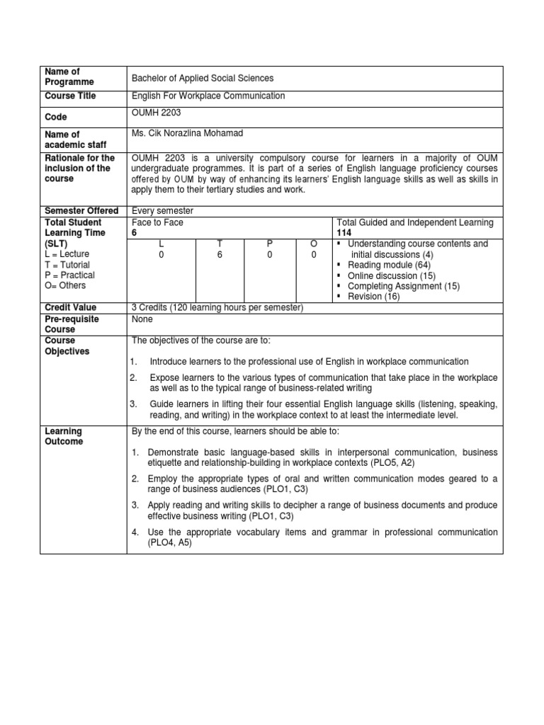 9 Toc Oumh2203 English For Workplace Communication Bass Learning Educational Assessment