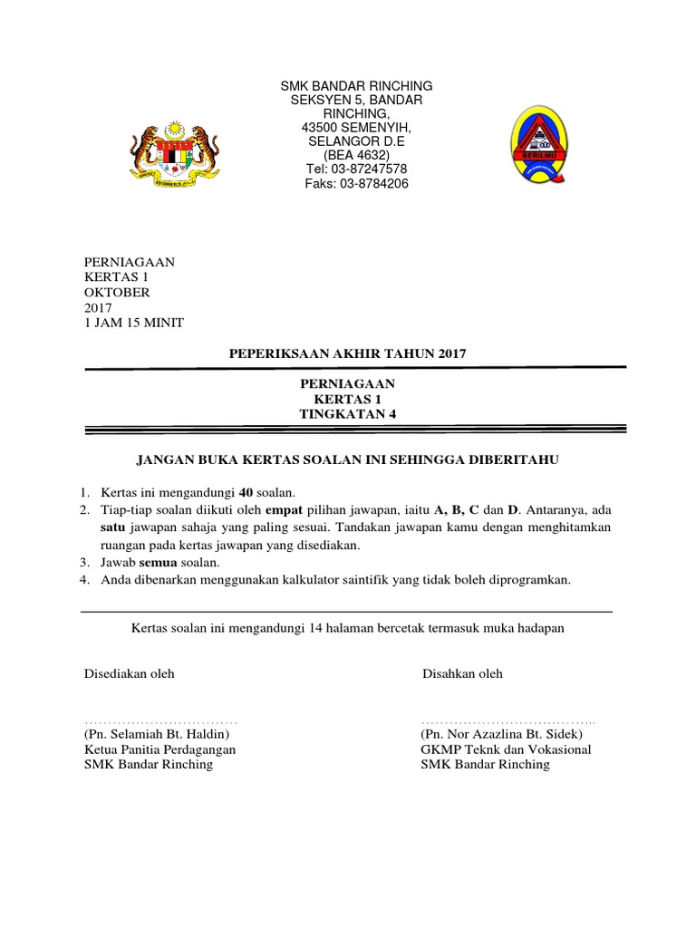 Contoh Soalan Peperiksaan Perniagaan Tingkatan 4 Muharram N
