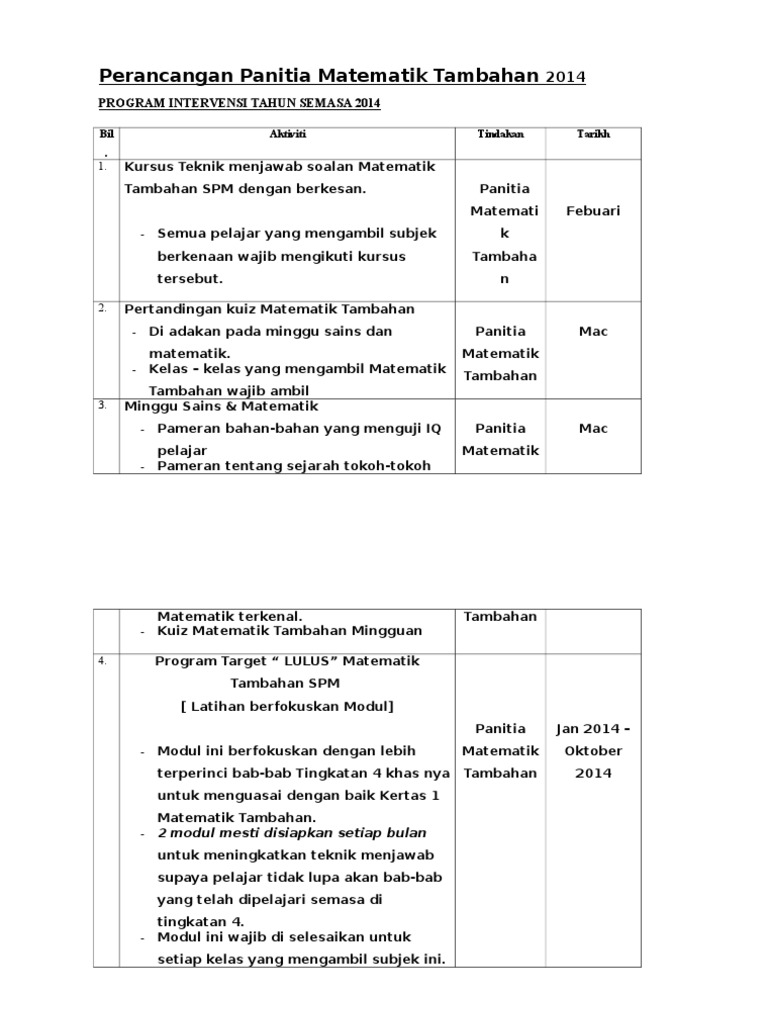 Perancangan Panitia Matematik Tambahan 2012