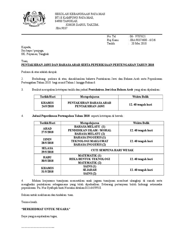 Surat Makluman Ibu Bapa Peperiksaan Akhir Tahun