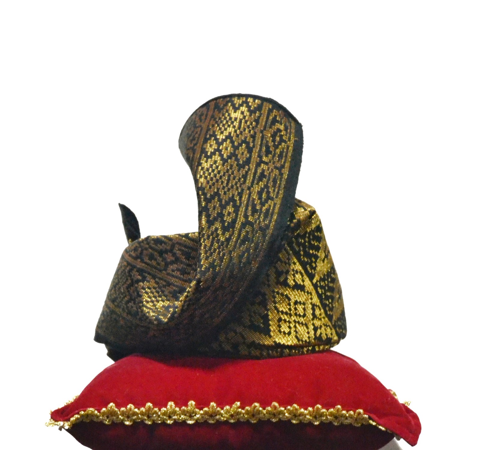 Replica Of The King S Tengkolok Diraja Royal Headress A Part Of The Regalia Of Malaysia It Is A Songket Made Of Black Fabric Embroidered In Gold Threads Wr