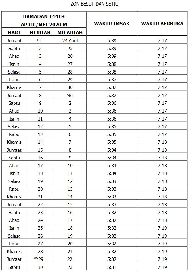Waktu Berbuka Imsak Seluruh Terengganu 2020