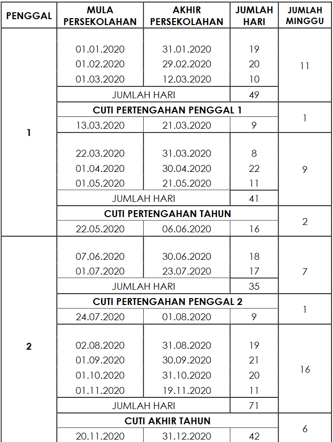 Takwin Persekolahan Tahun 2020