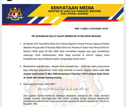 Covid19 Tatacara Tunai Solat Hajat Serentak Seluruh Negara Mohon Dijauhkan Wabak