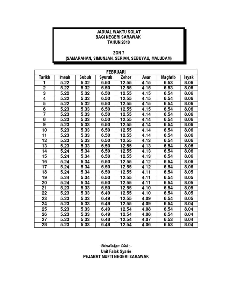 Jadual Solat Zon 8 Kuching Bau Lundu Sematan